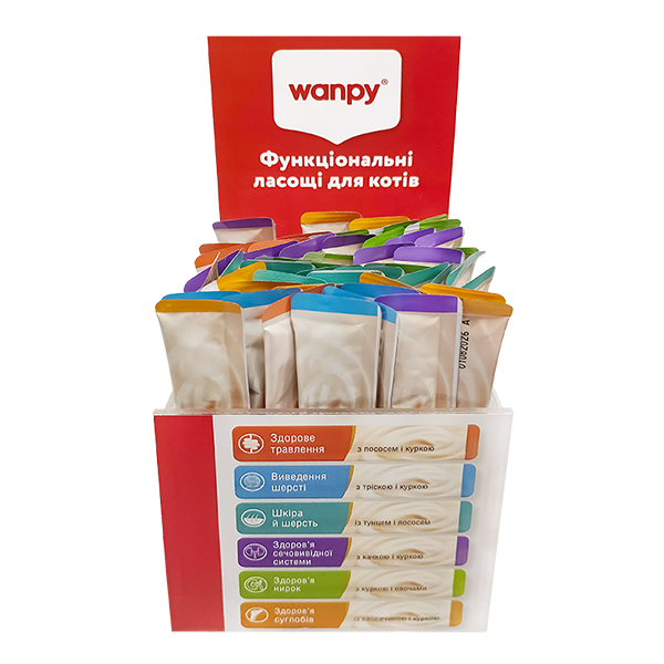 Стійка розрахована на 50 стіків по 14 г і продається разом із ласощами Wanpy в асортименті, що робить її готовим рішенням для викладки та збільшення імпульсних покупок. Яскравий брендований дизайн добре помітний на полиці або в касовій зоні.