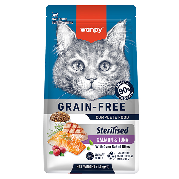 Wanpy Grain Free Sterilised Salmon & Tuna – це сучасний повнораціонний корм, розроблений з урахуванням змін у метаболізмі після стерилізації. Формула спрямована на контроль ваги, підтримання сечовидільної системи та загального здоров’я улюбленця.